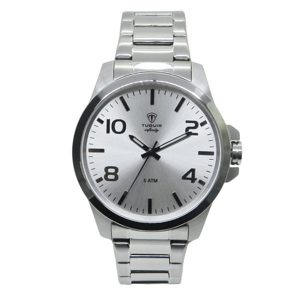 Relógio Masculino de Aço Tuguir Analógico Infinity 6117G Prata e Branco Marca: Tuguir Categoria: Analógico Analógico: Sim (1 Horário) Ponteiros Fluorescentes: Não Digital: Não Luz: Não Resistente à Água: 5 ATM (Pode ser usado para nadar no raso, por pouco tempo submerso) - Respingos: Sim - Chuva: Sim - Lavar Carro: Sim - Lavar Louça: Sim - Natação: Sim - Mergulho: Não Característica do Vidro: Cristal Mineral Tipo de Fecho: Dobrável Cor da Caixa: Prata Material da Caixa: Aço Formato da Caixa: Redondo Diâmetro da Caixa: 45,00 (mm) Espessura da Caixa: 10,00 (mm) Cor da Pulseira: Prata Material da Pulseira: Aço Largura da Pulseira: 20,00 (mm) Comprimento Máximo da Pulseira: 280,00 (mm) Alimentação: Bateria Interna Peso Líquido: 0,130 Kg Modelo: Infinity 6117G Cor Predominante: Prata Cor Diferencial: Branco Garantia: 12 Meses Conteúdo da Embalagem: 01 Relógio 01 Embalagem 01 Termo de Garantia
