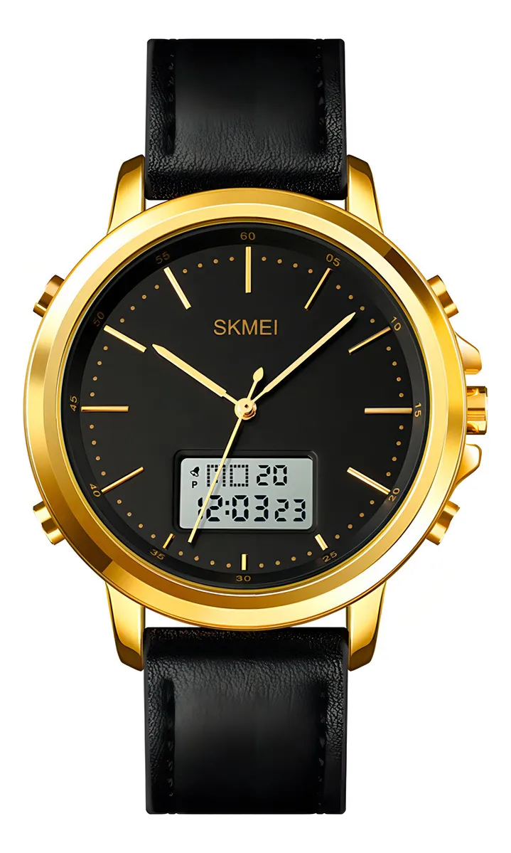 Relógio Masculino Skmei AnaDigi 1652 Preto e Dourado Marca: Skmei Categoria: AnaDigi Analógico: Sim (1 Horário) Ponteiros Fluorescentes: Não Digital: Sim (1 Horário) Calendário: Sim Despertador: Sim Mostra o Dia da Semana: Sim Mostra o Dia do Mês: Sim Cronômetro: Sim Contador Regressivo: Não Luz: Sim Cor da Iluminação: Azul Resistente à Água: 3 ATM (Resiste a imersões breves) - Respingos: Sim - Chuva: Sim - Lavar Carro: Sim - Lavar Louça: Sim - Natação: Não - Mergulho: Não Característica do Vidro: Cristal Mineral Tipo de Fecho: Fivela Cor da Caixa: Dourado Material da Caixa: Metal Banho IP Formato da Caixa: Redondo Diâmetro da Caixa: 44,00 (mm) Espessura da Caixa: 14,20 (mm) Cor da Pulseira: Preto Material da Pulseira: Couro Largura da Pulseira: 20,30 (mm) Comprimento Máximo da Pulseira: 230,00 (mm) Alimentação: Bateria Interna Peso Líquido: 0,072 Kg Modelo: 1652 Cor Predominante: Preto Cor Diferencial: Dourado Garantia: 12 Meses Conteúdo da Embalagem: 01 Relógio 01 Embalagem 01 Termo de Garantia Garantia do vendedor: 12 meses