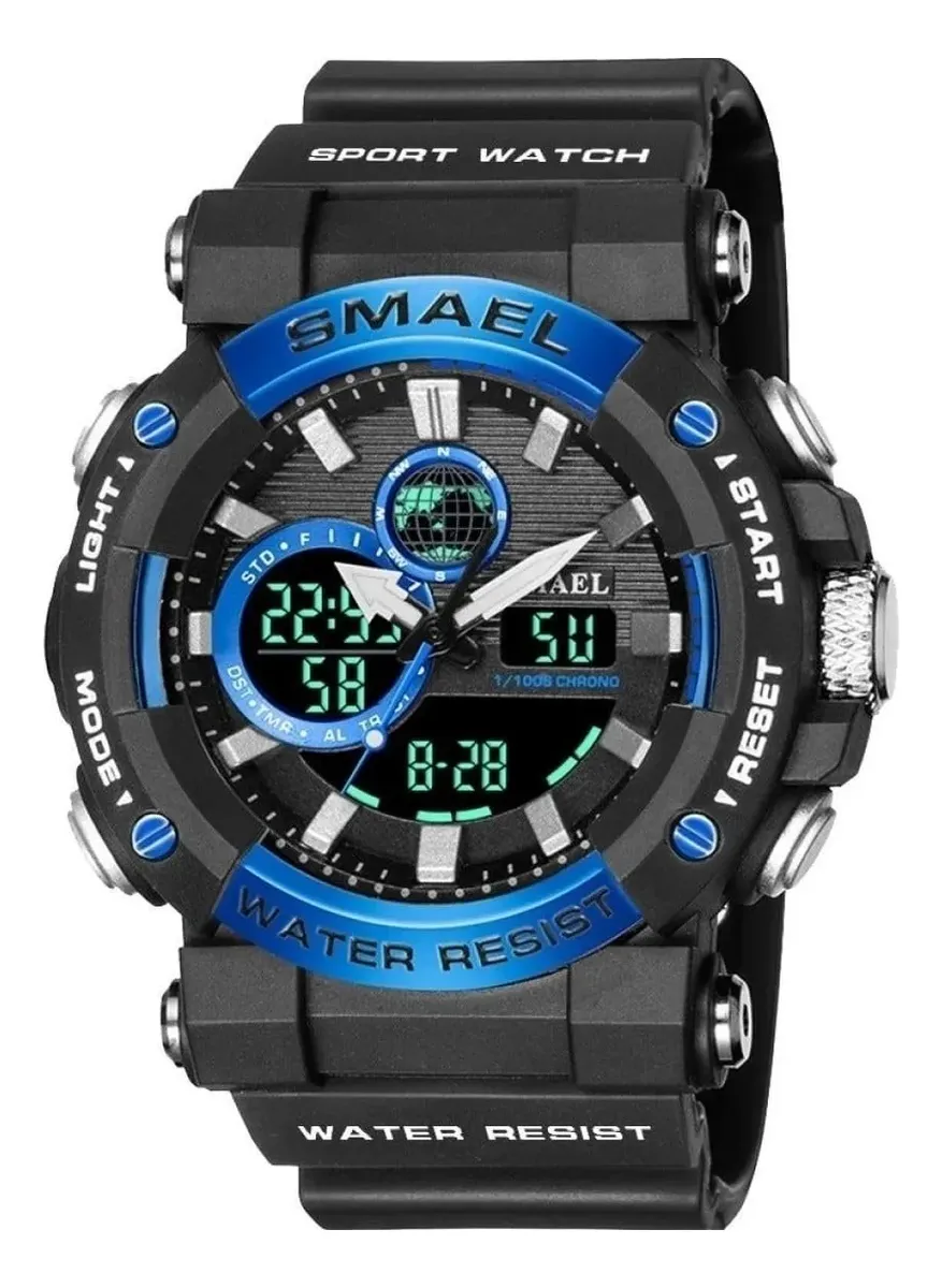 Relógio Masculino Smael AnaDigi 8048 Preto e Azul Marca: Smael Categoria: AnaDigi Analógico: Sim (1 Horário) Ponteiros Fluorescentes: Sim Digital: Sim (1 Horário) Calendário: Sim Despertador: Sim Mostra o Dia da Semana: Sim Mostra o Dia do Mês: Sim Cronômetro: Sim Contador Regressivo: Não Luz: Sim Cor da Iluminação: Verde Resistente à Água: 5 ATM (Pode ser usado para nadar no raso, por pouco tempo submerso) - Respingos: Sim - Chuva: Sim - Lavar Carro: Sim - Lavar Louça: Sim - Natação: Sim - Mergulho: Não Característica do Vidro: Acrílico Tipo de Fecho: Fivela Cor da Caixa: Preto Material da Caixa: Plástico Formato da Caixa: Redondo Diâmetro da Caixa: 48,00 (mm) Espessura da Caixa: 19,00 (mm) Cor da Pulseira: Preto Material da Pulseira: Borracha Largura da Pulseira: 22,00 (mm) Comprimento Máximo da Pulseira: 250,00 (mm) Alimentação: Bateria Interna Peso Líquido: 0,074 Kg Modelo: 8048 Cor Predominante: Preto Cor Diferencial: Azul Garantia: 12 Meses Conteúdo da Embalagem: 01 Relógio 01 Embalagem 01 Termo de Garantia