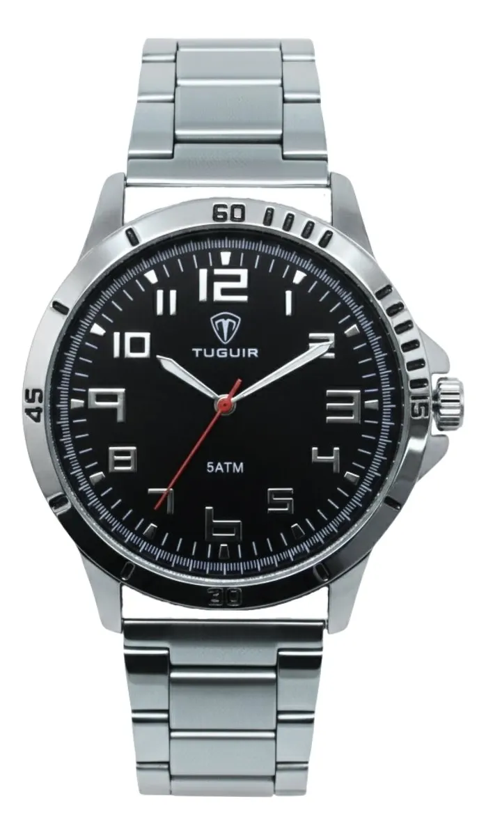 Relógio Masculino Tuguir Analógico TG222-2C Prata e Preto Marca: Tuguir Categoria: Analógico Analógico: Sim (1 Horário) Ponteiros Fluorescentes: Não Digital: Não Luz: Não Resistente à Água: 5 ATM (Pode ser usado para nadar no raso, por pouco tempo submerso) - Respingos: Sim - Chuva: Sim - Lavar Carro: Sim - Lavar Louça: Sim - Natação: Sim - Mergulho: Não Característica do Vidro: Cristal Mineral Tipo de Fecho: Dobrável com Botão Cor da Caixa: Prata Material da Caixa: Metal Banho IP Formato da Caixa: Redondo Diâmetro da Caixa: 44,00 (mm) Espessura da Caixa: 9,00 (mm) Cor da Pulseira: Prata Material da Pulseira: Aço Largura da Pulseira: 19,50 (mm) Comprimento Máximo da Pulseira: 280,00 (mm) Alimentação: Bateria Interna Peso Líquido: 0,100 Kg Modelo: TG222-2C Cor Predominante: Prata Cor Diferencial: Preto Garantia: 12 Meses Conteúdo da Embalagem: 01 Relógio 01 Embalagem 01 Termo de Garantia