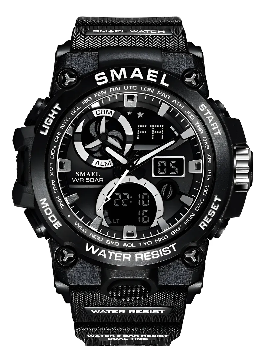 Marca: Smael Categoria: AnaDigi Analógico: Sim (1 Horário) Ponteiros Fluorescentes: Não Digital: Sim (1 Horário) Calendário: Sim Despertador: Sim Mostra o Dia da Semana: Sim Mostra o Dia do Mês: Não Cronômetro: Sim Contador Regressivo: Não Luz: Sim Cor da Iluminação: Verde - Respingos: Sim - Chuva: Sim - Lavar Carro: Sim - Lavar Louça: Sim - Natação: Sim - Mergulho: Não Característica do Vidro: Acrílico Tipo de Fecho: Fivela Cor da Caixa: Preto Material da Caixa: Plástico Formato da Caixa: Redondo Diâmetro da Caixa: 50,00 (mm) Espessura da Caixa: 18,00 (mm) Cor da Pulseira: Preto Material da Pulseira: Borracha Largura da Pulseira: 22,00 (mm) Comprimento Máximo da Pulseira: 240,00 (mm) Alimentação: Bateria Interna Peso Líquido: 0,070 Kg Modelo: 8011 Cor Predominante: Preto Conteúdo da Embalagem: 01 Relógio 01 Embalagem