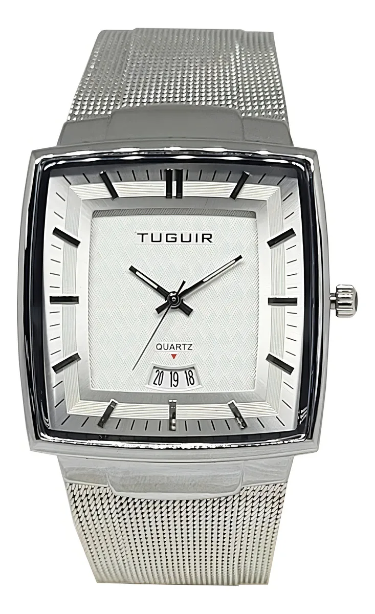 Relógio Unissex Tuguir Analógico TG30335 Prata =================================================================== Características Técnicas do Produto: Tipo: Relógio Subtipo: De Pulso Marca: Tuguir Modelo: TG30335 Cor Predominante: Prata Categoria: Analógico Analógico: Sim (1 Horário) Calendário: Sim Mostra o Dia do Mês: Sim Tipo de Vidro: Cristal Mineral Cor da Caixa: Prata Material da Caixa: Metal Banho IP Formato da Caixa: Quadrado Largura da Caixa: 3,7 centímetros / 37 milímetros Comprimento da Caixa: 3,7 centímetros / 37 milímetros Espessura da Caixa: 1,0 centímetros / 10 milímetros Cor da Pulseira: Prata Material da Pulseira: Aço Largura da Pulseira: 2,2 centímetros / 22 milímetros Comprimento Máximo da Pulseira: 22 centímetros / 220 milímetros Tipo de Fecho: Gancho Alimentação: Bateria Interna Peso Líquido: 0.080 Kg Resistente à Água: 30 Metros / 3 ATM (Resiste a imersões breves em água, como chuvas e lavagens de mãos.) Respingos: Sim Chuva: Sim Lavar Carro: Sim Lavar Louça: Sim Natação: Não Mergulho: Não